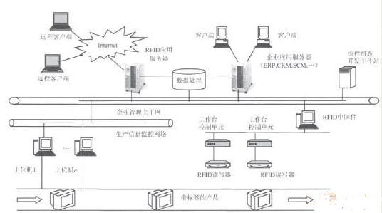 RFID应用系统采用开放式架构,集中管理分散控制,即每条生产线采用分散控制,对企业整体生产管理进行集中管理,从而有机整合分布式控制系统、生产调度系统和管理决策系统。